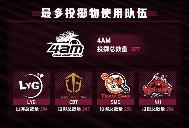 4AM职业队参赛选手Long场均生存時间最多,为,4AM总抛掷327个,位居第一。