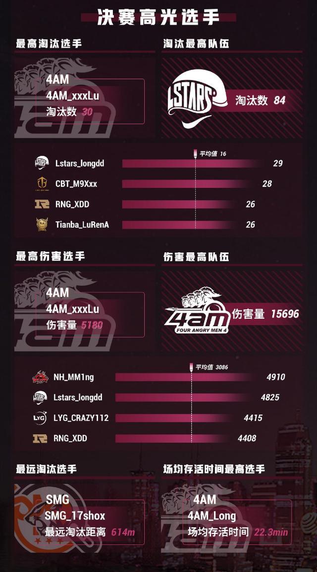 4AM小羊是决赛导致损害量最大的参赛选手,4AM职业队也是决赛导致损害量最大的职业队,SMG职业队工作人员17shox造就了比较远的取代,间距为612m。